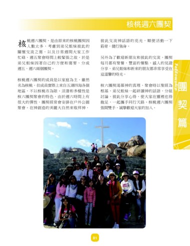 很大的彈性,團契經常會安排在戶外公園 飽足,一起攜手同行天路。核桃週六團契