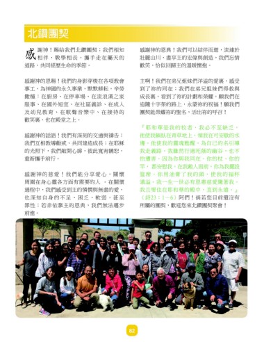 感 謝神!賜給我們北鑽團契;我們相知 感謝神的恩典!我們可以結伴而遊,流連於